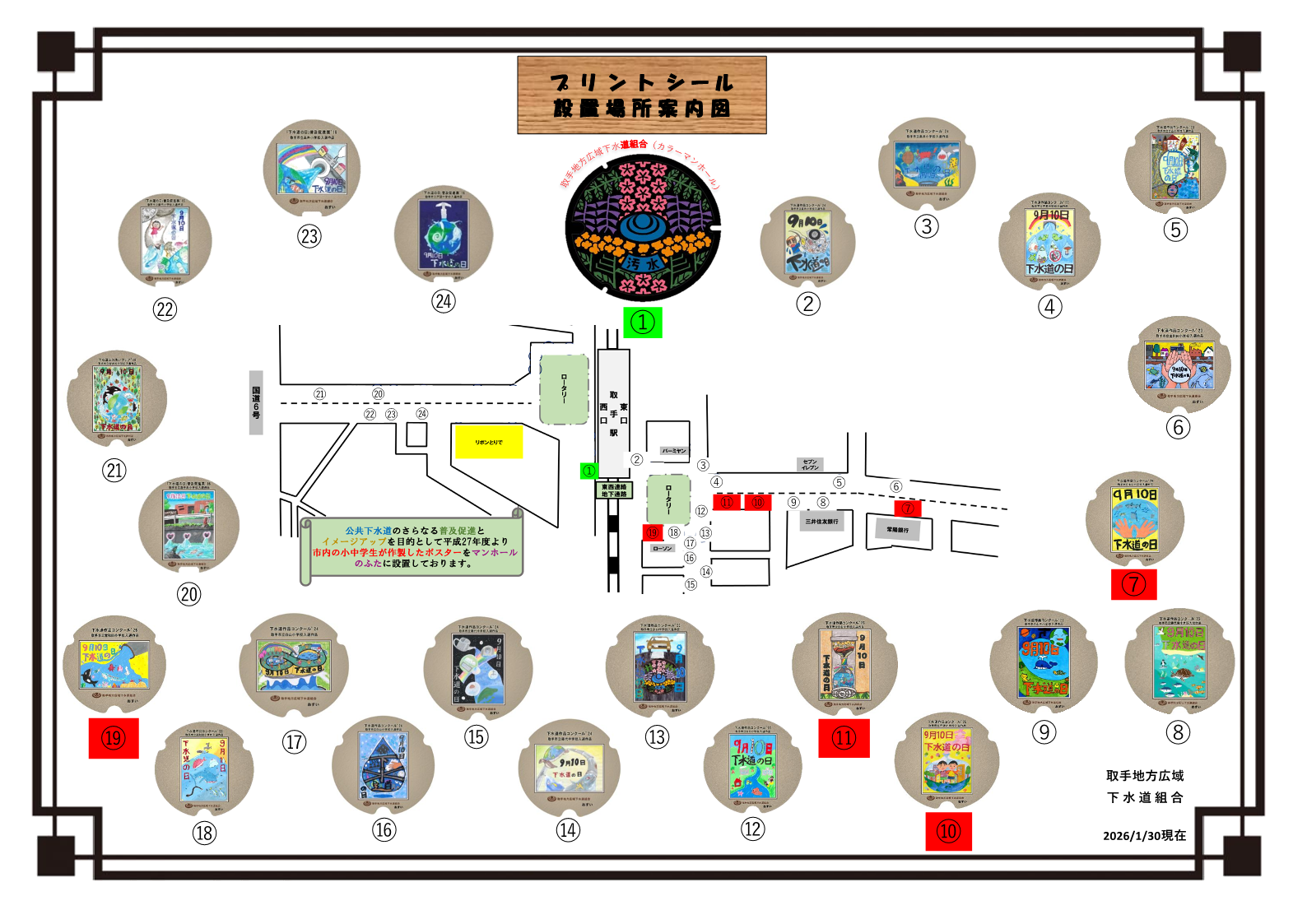 公共下水道の広報活動として、市内の小中学校から募集したポスター作品の中から、受賞作品を取手駅周辺のマンホールに設置しています。ぜひ、探して見てください!